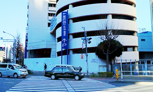 C7出口を出て直進すると目の前に伊勢丹の立体駐車場の建物が見えます。