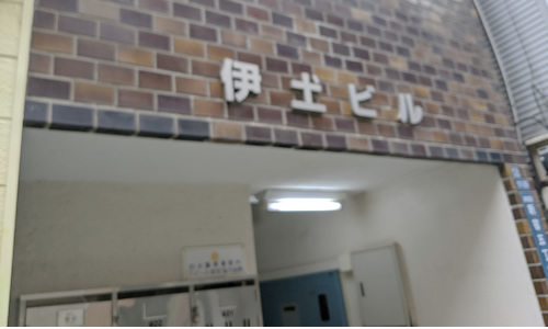 ビルの入り口が見えてきました。3階に階段で上がってください。エレベーターはありません。