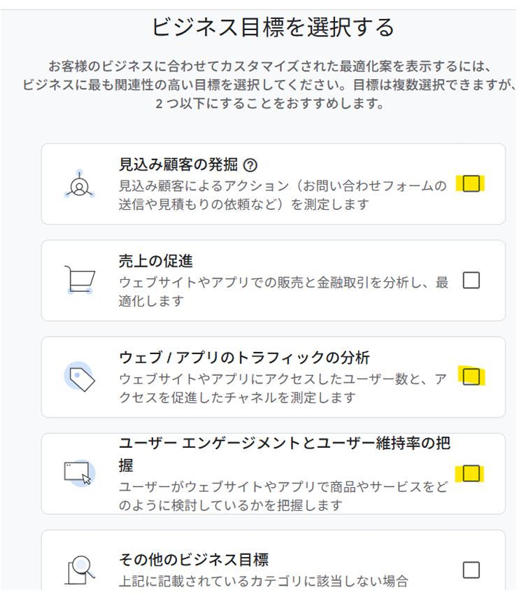 リードを目的とするなら「見込み客の発掘」「ウェブ/アプリのトラフィックの分析」「ユーザーエンゲージメントとユーザー維持率の把握」にチェック。E-commerceならこれらに加えて「売り上げの促進」をチェックがお勧めです。
